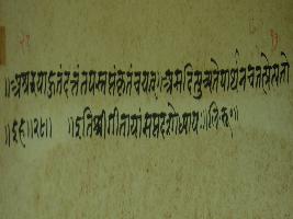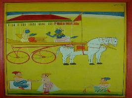 | Description / विवरण | Miniature painting based on Shri Bhagwat Gita. It depicts Krishna preaching Arjun, in the lower part of the painting depicts king is sitting, one noble has came and king gifted him something, and one noble is performing yagna. |