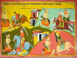 | Description / विवरण | Miniature painting based on Harivansha depicting Parasurama taken 21 birth on the earth and defeating different kings, which is shown in different panels. |