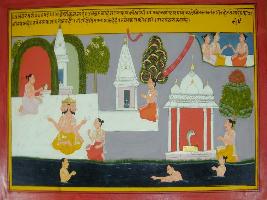 | Description / विवरण | Miniature painting based on Mahabharat - Vana parva. It is a scene of a river, on the bank there is depiction of three temples, it is said here that going to Shri kunj and worshipping Brahma is equal to giving thousand cows in return, some people are depicted taking holy dip in the river one female belongs to a snake god. |