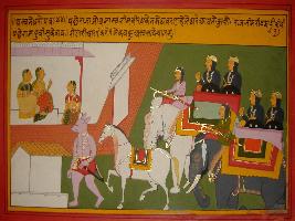 | Description / विवरण | Miniature painting based on Mahabharat - Ashwamegh parva depicting Jambanaswa is taking to Bhim, Brishketu of Meghvaran to his place. Then king praised Bhim and ask his daughter to welcome Bhim. |