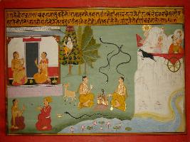 | Description / विवरण | Miniature painting based on Prithviraj Raso depicting Chandvardai telling king that when king Janmejaya performed yagna snakes came out. The snakes looked like the hair of a lady. |