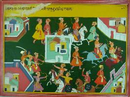 | Description / विवरण | Miniature painting based on Mahabharat - Sabha parva depicting Arjun fighting and moving ahead. |
