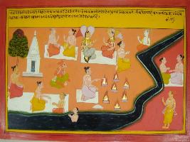 | Description / विवरण | Miniature painting based on Mahabharat - Vana parva depicting a river and Shiv is depicted sitting on the bank. There is also one temple, a sage is depicted performing an yagna, here Sadhu, Gandharvas and Apsaras are also depicted. A man is depicted taking holy dip in the river. |