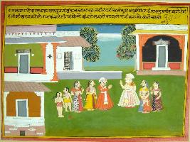 | Description / विवरण | Miniature painting based on Krishna charit depicting arrival of Akrura at Vrindavan Akrura offering namaskara and Nanda welcoming him with Yashoda and Rohini. |