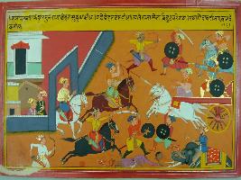 | Description / विवरण | Miniature painting based on Mahabharat - Sabha parva depicting Arjun after defeating Brihadstha than moves towards Godavari and conqured Bamdeva. |