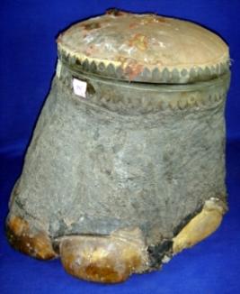 | Description / विवरण | Box made of elephant foot, round in shape and padded with velvet cloth from inside. It has a lid which too is padded from inside. |