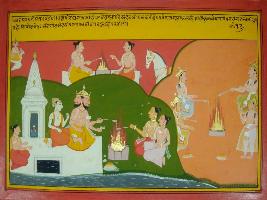 | Description / विवरण | Miniature painting based on Mahabharat - Vana parva. It is scene on the banks of the river. It is depicted herethat worshipping of Brahma is equal to performing of Raj suya yagna on the bank of river a temple is depicted Shiv and Brahma depicted sitting and Brahma is depicted performing yagna with two sages. |