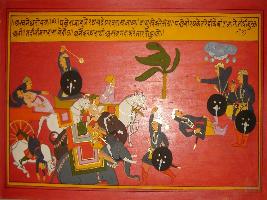 | Description / विवरण | Miniature painting based on Mahabharat - Ashwamegh parva It depicts how king Jambanaswa gets up on a chariot and start fighting with Vayu. He is very brave and is killing many elephants and horses. |