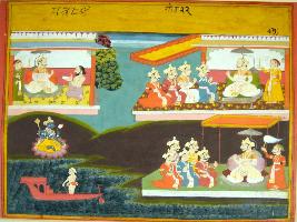 | Description / विवरण | Miniature painting based on Krishna charit depicting three scene where Raja Kansa is seen talking with his subject. In the middle Vishnu is seen in Padmasana while a boy is depicts in the lower right side that boating on the river. |