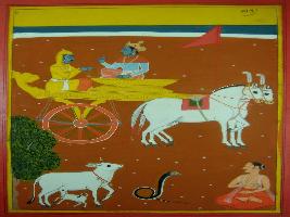 | Description / विवरण | Miniature painting based on Shri Bhagwat Gita. It depicts Krishna preaching Arjun, in the lower part of the painting depicts one Brahman is meditating and one snake and cow and her calf is standing. |