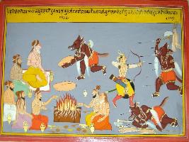 | Description / विवरण | Miniature painting based on Harivansha depicting killing of Lavanasur. At the right portion, Lavanasur carrying a big block of stone and coming toward sages sitting and trying to disturb on going yagna. At the left portion, he is shown fighting with Shatrughana. At the lower left part, he is shown lying dead on ground. |