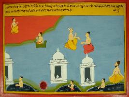 | Description / विवरण | Miniature painting based on Mahabharat - Vana parva. Here is the depiction of the Kedar nath pilgrim place. On the river is depicted flowing and on the bank three temples are depicting and one sage is depicted doing hard penance on bank, in the river three men are depicting taking holy dip in river water. |