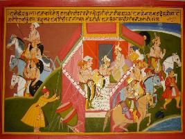 | Description / विवरण | Miniature painting based on Prithviraj Raso depicting Prithviraj in camp and meeting Madhushah Ram. At the left side king Prithviraj is depicted moving towards Kannauj. A man is seen beating drums. |