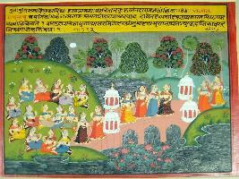 | Description / विवरण | Miniature painting based on Krishna Lila depicting Gopis are talking in group. It is the scene of right full moon shown some Gopis are shown coming out of the palace. |