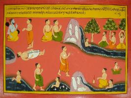 | Description / विवरण | Miniature painting based on Mahabharat - Vana parva depicting a river on whose bank sages are depicting doing penance. Narad is depicting holding Veena and talking to man, some peole are depicting taking holy dip in the river and one man is depicting performing yagna on the bank. |
