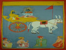 | Description / विवरण | Miniature painting based on Shri Bhagwat Gita. It depicts Krishna preaching Arjun, in the lower part of the painting depicts king is sitting with his nobles and discussing. |