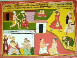 | Description / विवरण | Miniature painting based on Harivansha depicting fight between two kings on the left part, below them another king is lying dead. In the upper right part, a person is snatching the Gather of a lady and in lower right part, a king is depicted, sitting and talking with two sages. |