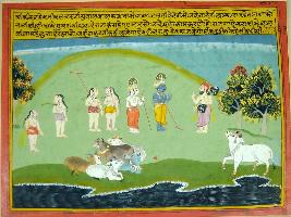 | Description / विवरण | Miniature painting based on Krishna charit depicting Krishna and Balram playing with gopas. At the same time a person is telling them about Kansa s cruelty in Mathura and condition Vasudev and Devki. He asks Krishna to reach Mathura. |