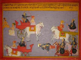 | Description / विवरण | Miniature painting based on Mahabharat - Ashwamegh parva depicting the war between king Shalya and Krishna. Vaispayan is telling Janmejaya about this war. He says that Shalya fires a weapon towards Krishna and in return Krishna makes Shalya unconscious. |