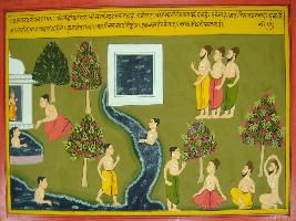 | Description / विवरण | Miniature painting based on Mahabharat - Vana parva depicting diffrent tirtha. After visiting Suraj tirtha, next tirth would be of Lakshmivana near the bank of Saraswati river. One day. some sages came to Lakshmivana they went to Kurushetra. After Kurushetra, Saraswati river is flown near by. There is one forest situated near Sarawati river which gives fruits of one ashmedha yagna to visitor. |