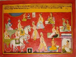 | Description / विवरण | Miniature painting based on Mahabharat - Ashwamegh parva depicting Krishna asking Brishketu why he left Dwarika and came to him. The left side of the painting depict different activities like eating food, making love etc. |