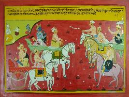 | Description / विवरण | Miniature painting based on Mahabharat - Ashwamegh parva depicting while Brishketu and Pradyuman are moving, then king Shalya come their way and ask why they are going from Dwarika and he ask for war. |