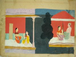 | Description / विवरण | Miniature painting depicting Nayak and Nayika talking to each other on left side while she is telling her friend about her meeting on right part. It is an incomplete painting. |