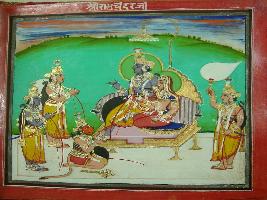 | Description / विवरण | Miniature painting depicting Ram. He is depicted sitting with Sita and Lakshman and Hanuman is depicted sitting in front of him. |