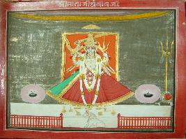 | Description / विवरण | Miniature painting depicting Shri Mataji Amba ji the goddess is depicted ornamented heavily and a lion is depicted sitting in front of the goddess. |