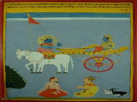 | Description / विवरण | Miniature painting based on Shri Bhagwat Gita. It depicts Krishna preaching Arjun that person who knows about himself and knows about grief and happiness, he is a Param yogi. |