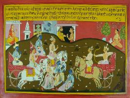 | Description / विवरण | Miniature painting based on Mahabharat - Ashwamegh parva depicting fight between Pradyuman and Shalya. Shalya attacks on Pradyuman and Krishna send Pradyuman back to home. |