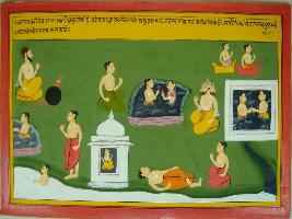 | Description / विवरण | Miniature painting based on Mahabharat - Vana parva. This painting is depicting Shukracharya is telling about tirtha. After visiting Brahmajoni one can get Brahmlok. In this painting, sage is shown taking bath in river worshipping Brahma and going in viman. |