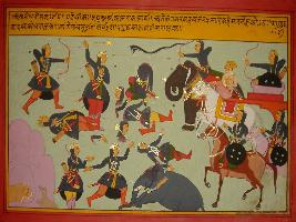 | Description / विवरण | Miniature painting based on Mahabharat - Ashwamegh parva depicting the war scene in which Pradyuman is fighting. A very furious war is going on where the head and hands of warriors are lying around. |