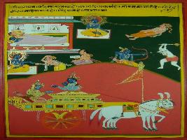 | Description / विवरण | Miniature painting based on Shri Bhagwat Gita. It depicts Krishna preaching Arjun that earth knows that taking birth on earth is ones Karma duty . So, he took birth and performed his duty. Then he will die like other human. |