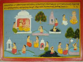 | Description / विवरण | Miniature painting based on Mahabharat - Vana parva. This painting is depicting men performing activities - like taking bath, worshipping at temple at different tirths like Shastra tirtha, Doya tirtha, Renuka tirtha, Vimochana tirtha and Panchavati. At Panchavati, man worship Shiv and Brahma revealed himself at upper left part. |