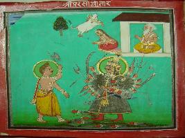 | Description / विवरण | Miniature painting depicting Parasurama the sixth incarnation of Vishnu and he is depicted killing Sahastrajuna with axe. Sahastrajuna is depicted having many heads and Parasurama is depicted with a hallo on his head. |