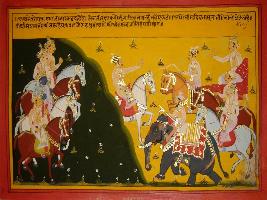 | Description / विवरण | Miniature painting based on Mahabharat - Ashwamegh parva depicting that king Shalya is telling his army to arrest Krishna and Arjun. He is giving directions to his army and saying catch Krishna and we will give him punishment. |