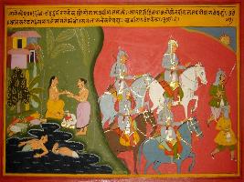 | Description / विवरण | Miniature painting based on Prithviraj Raso depicting Prithviraj and all his samantas taking holy dip in the river and doing danas. After that all of them move forward. |