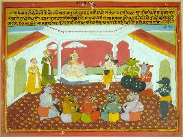 | Description / विवरण | Miniature painting based on Krishna charit depicting the scene of court of Kansa where he is sitting on throne and a sage is standing in front of him. He is probably Narad muni. Some demons are seated in court. |