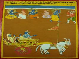 | Description / विवरण | Miniature painting based on Shri Bhagwat Gita. It depicts Krishna preaching Arjun that his disciple who knows him would following path. |
