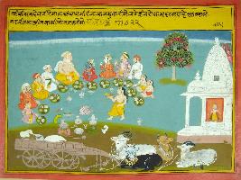 | Description / विवरण | Miniature painting based on Krishna Lila depicting Krishna shown taking meal along with the Braj people of Mathura. Temple is shown in the left side and below Nandi are shown seated. |