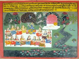 | Description / विवरण | Miniature painting based on Krishna Lila depicting Krishna left the cushion where chakra hookah are shown. Krishna is seated on mat along with number of Gopis in the Garden. |