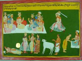 | Description / विवरण | Miniature painting based on Mahabharat - Sabha parva depicting Sishupal is insulting Vishma that by giving dana he can t gain punya as he is without sons. |