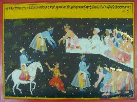 | Description / विवरण | Miniature painting based on Mahabharat - Ashwamegh parva depicting Krishna coming to Indraprastha and dancers are welcoming him. After that Krishna meets Yudhisthir. |