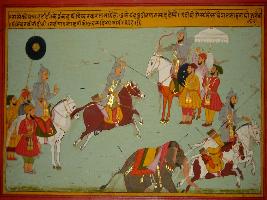 | Description / विवरण | Miniature painting based on Prithviraj Raso depicting a noble from Prithviraj s army, attacks on the army of Badshah which is depicted on the left hand side of the painting. Badshah leaved the battle field. |
