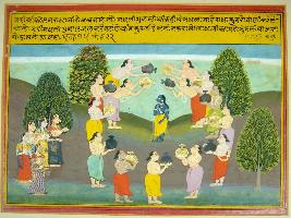 | Description / विवरण | Miniature painting based on Krishna Lila Krishna is being bathed by the people of Braj after Holi and rath along with her companion or friend are watching. |