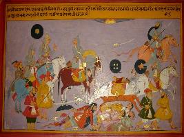 | Description / विवरण | Miniature painting based on Prithviraj Raso depicting defeat of Badshah and a noble of Prithviraj named Chand Pundeer put him on the neck of his horse that depicts on the centre of the painting. |