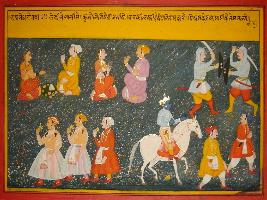 | Description / विवरण | Miniature painting based on Mahabharat - Ashwamegh parva depicting on the upper part a female is serving food to a man and talking to another man. At the upper left two warriors are fighting. The lower part depict three men are holding flowers in their hands. The lower part depict Krishna is moving forward with two men. |