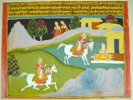| Description / विवरण | Miniature painting based on Krishna avatar charit, in this painting king Parikshit is depicted. Due to advent of Kalyug, he annoys a rishi who is doing penance and puts dead snake on the neck of rishi Shringi for which rishi Shringi s son curses him to death by snake bite. |
