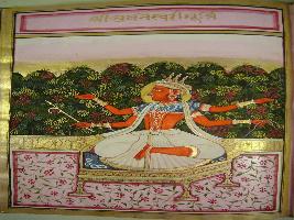 | Description / विवरण | Miniature painting depicting the four handed Bhuveneshwari murti sitting on the decorated pedestal. |